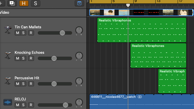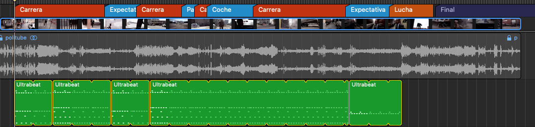 Nuevamente con una secuencia de Wong Kar-Wai (Hong-Kong, 2000) he incluido un reloj ajustado a un tempo de 120 BPM a través de la herramienta flex, donde he automatizado el volumen para que vaya aumentando conforme va avanzando la escena. Además he incluido tres diferentes sintetizadores percusivos que van apareciendo progresivamente para aumentar la tensión con un arpegio de Eb con quinta aumentada.