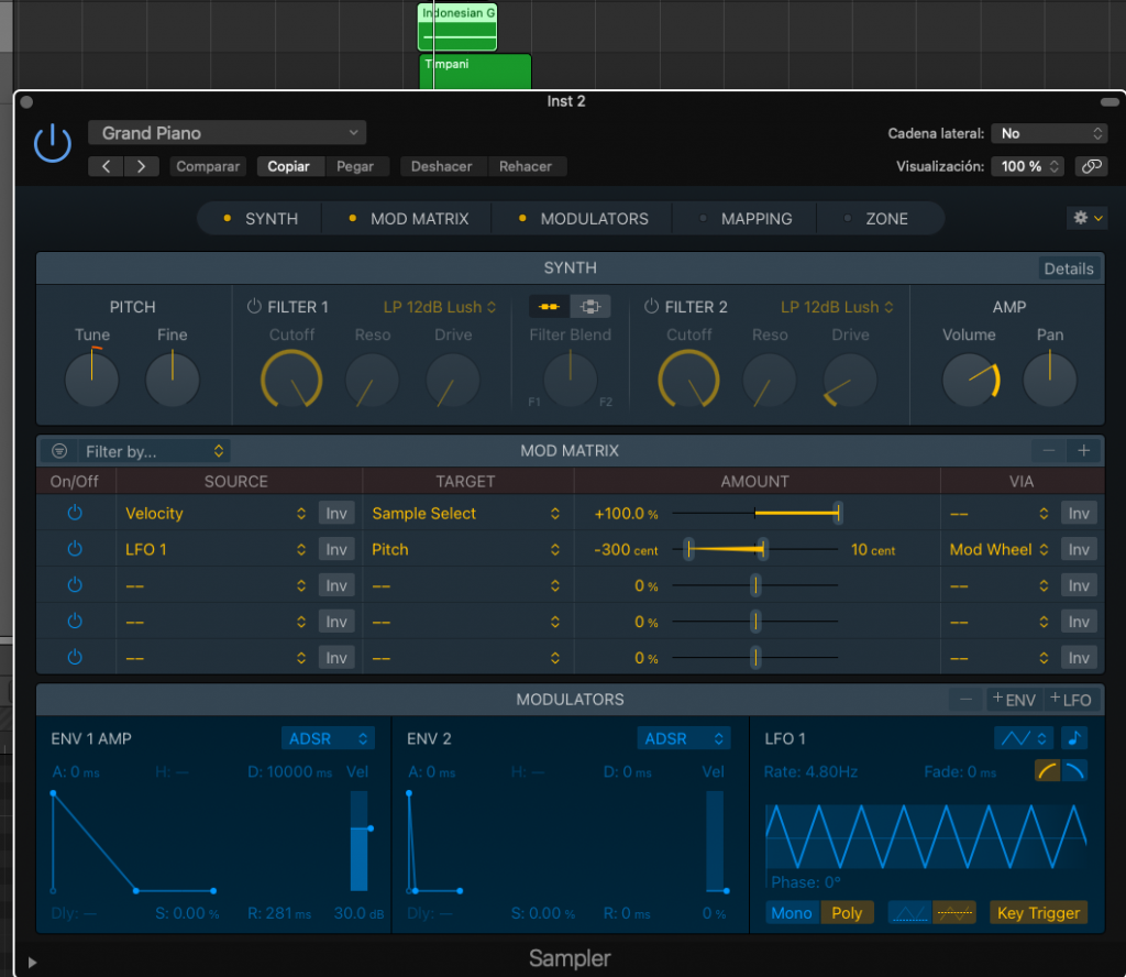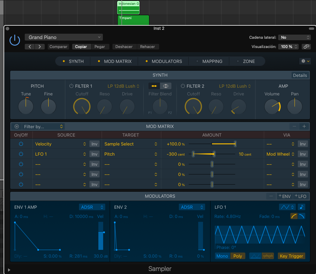 Para crear este efecto cómico del impacto del Coyote, he utilizado un piano con una modulación de frecuencia LFO en 4.80 Hz