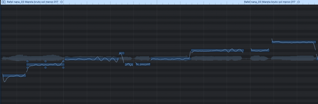 Fragmentación de la voz por notas. Flex pitch y corrección del vibrato. Duplicado de esta pista y transposición de una tercera mayor para crear un coro de la voz principal.