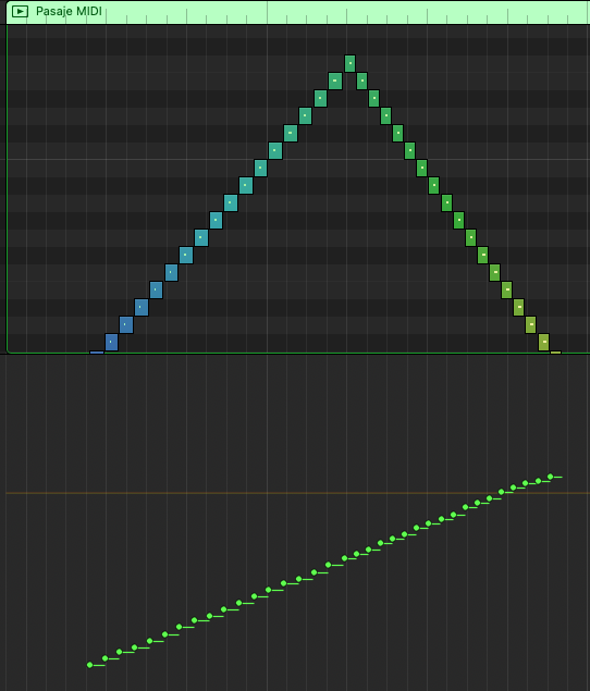 Con esta secuencia de Toki wo kakeru shoujou (2006) he creado una escala cromática ascendente y descendente para crear esta transición melódica cómica, modificando los valores de velocidad de MIDI y ajustando la velocidad del tempo para ajustarla a la animación.